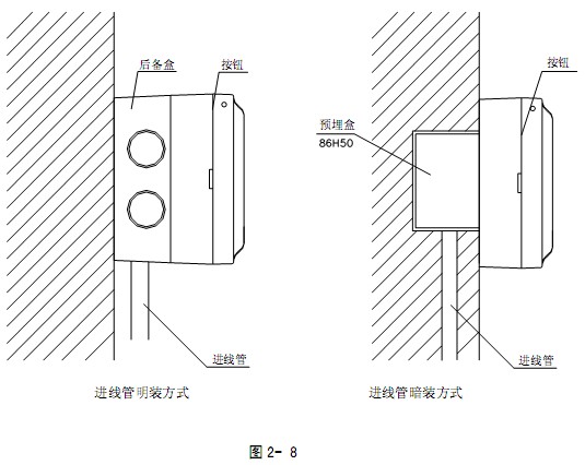 手動(dòng)火災(zāi)報(bào)警按鈕安裝時(shí)只需拔下報(bào)警按鈕,從底殼的進(jìn)線孔中穿入電纜并接在相應(yīng)端子上,再插好報(bào)警按鈕即可安裝好報(bào)警按鈕,安裝孔距為60mm。報(bào)警按鈕安裝采用進(jìn)線管明裝和進(jìn)線管暗裝兩種方式,如圖2-8所示。