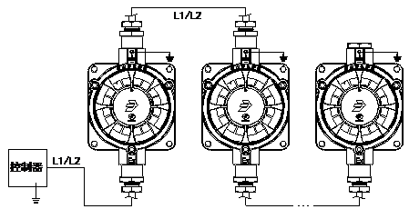 端子L1、L2分別接信號(hào)線L1和L2,無極性,信號(hào)線采用ZR-RVS-2×1.5mm2雙絞線。